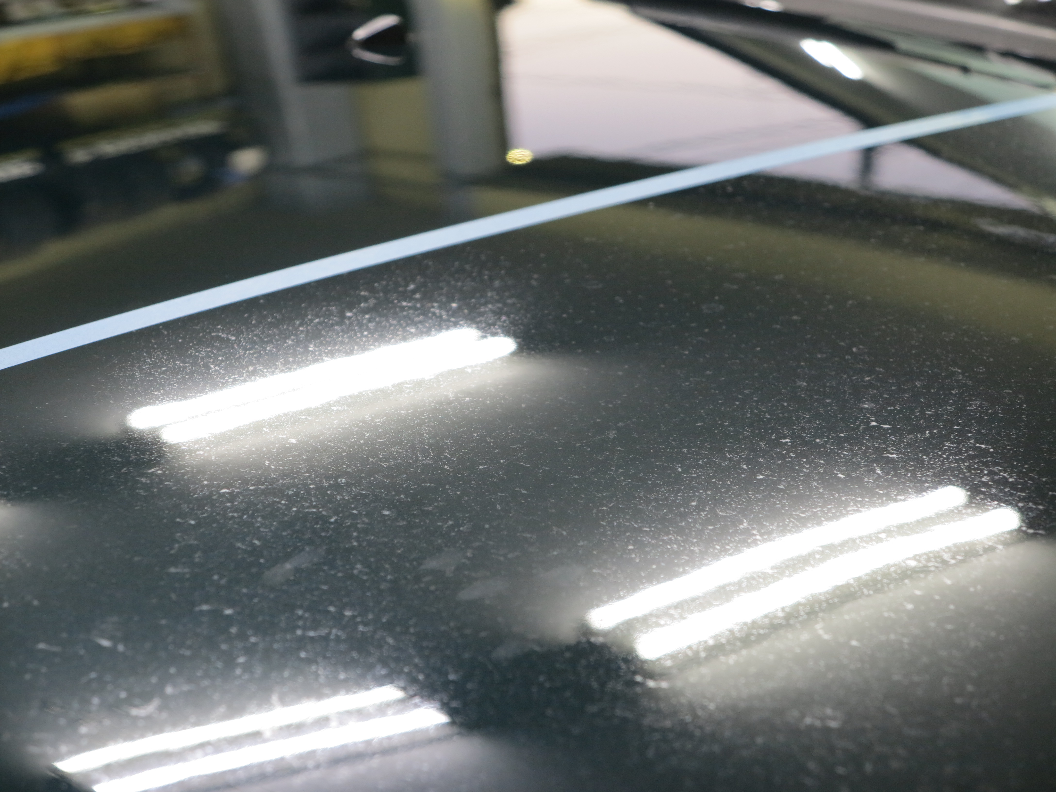 お車の塗装が雨と太陽に当たり、表面に沢山のウロコの様な感じで入庫いたしました。