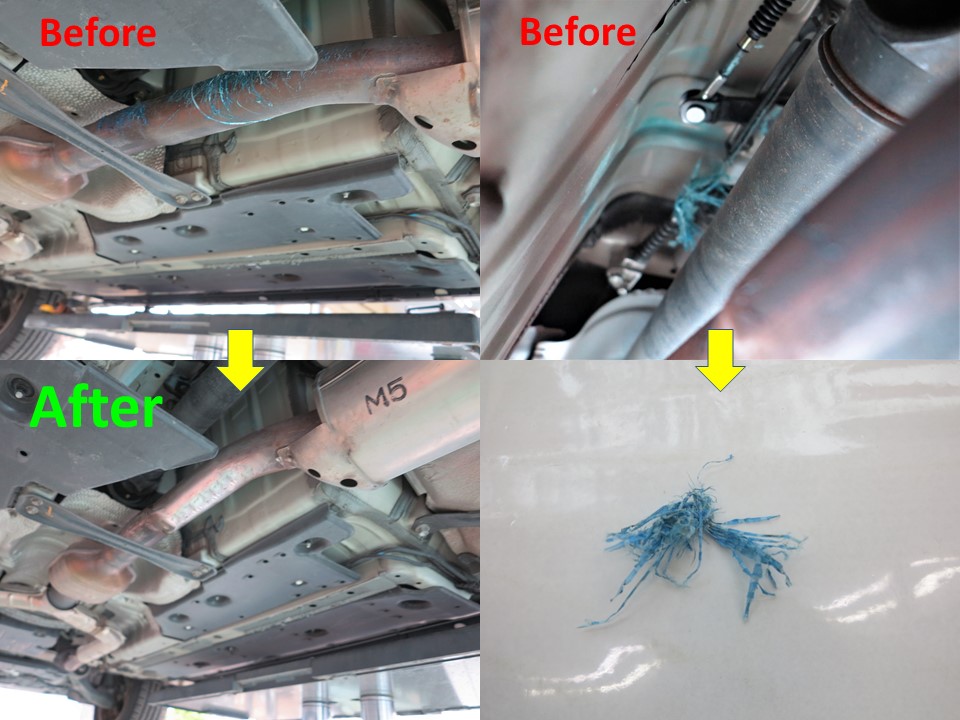 幸いな事に、巻き込む程の量は見受けられなかったものの、エキゾースト・マフラーのフロントパイプ部分に、ブルーシートの一部が付着してしまっております。こうなりますと、乗っていて鼻につく様な不快な臭いが車室内に入ってきてしまいますし、何よりも危険なのでお客様の迅速な判断でご入庫いただき良かったと思います。