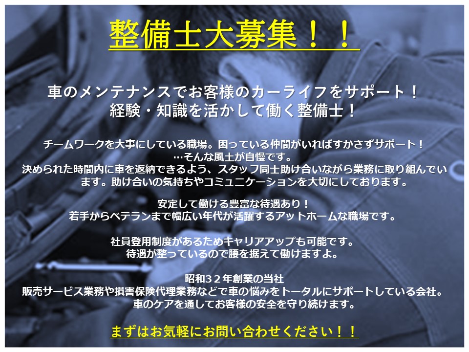 販売サービス業務や損害保険代理業務などで車の悩みをトータルにサポートしている会社。車のケアを通してお客様の安全を守り続けます。