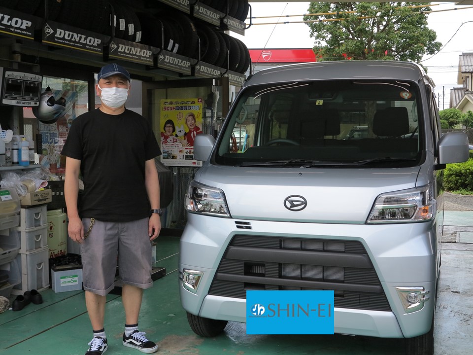 新車のハイゼット クルーズターボ マニュアル車を本日千葉県にお住いのM様にご納車させて頂きました。新栄の向かいにあるハーレーダビッドソン専門のバイク屋レンチさんよりご紹介頂いたお客様でございます。エンブレムをレンチさんが塗りプチカスタムなハイゼットになりM様もご満悦な表情でございました。